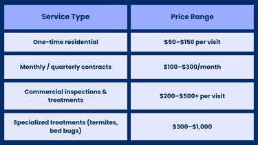 Pricing depends on type of pest, size of area, and whether it’s one-time or recurring.
